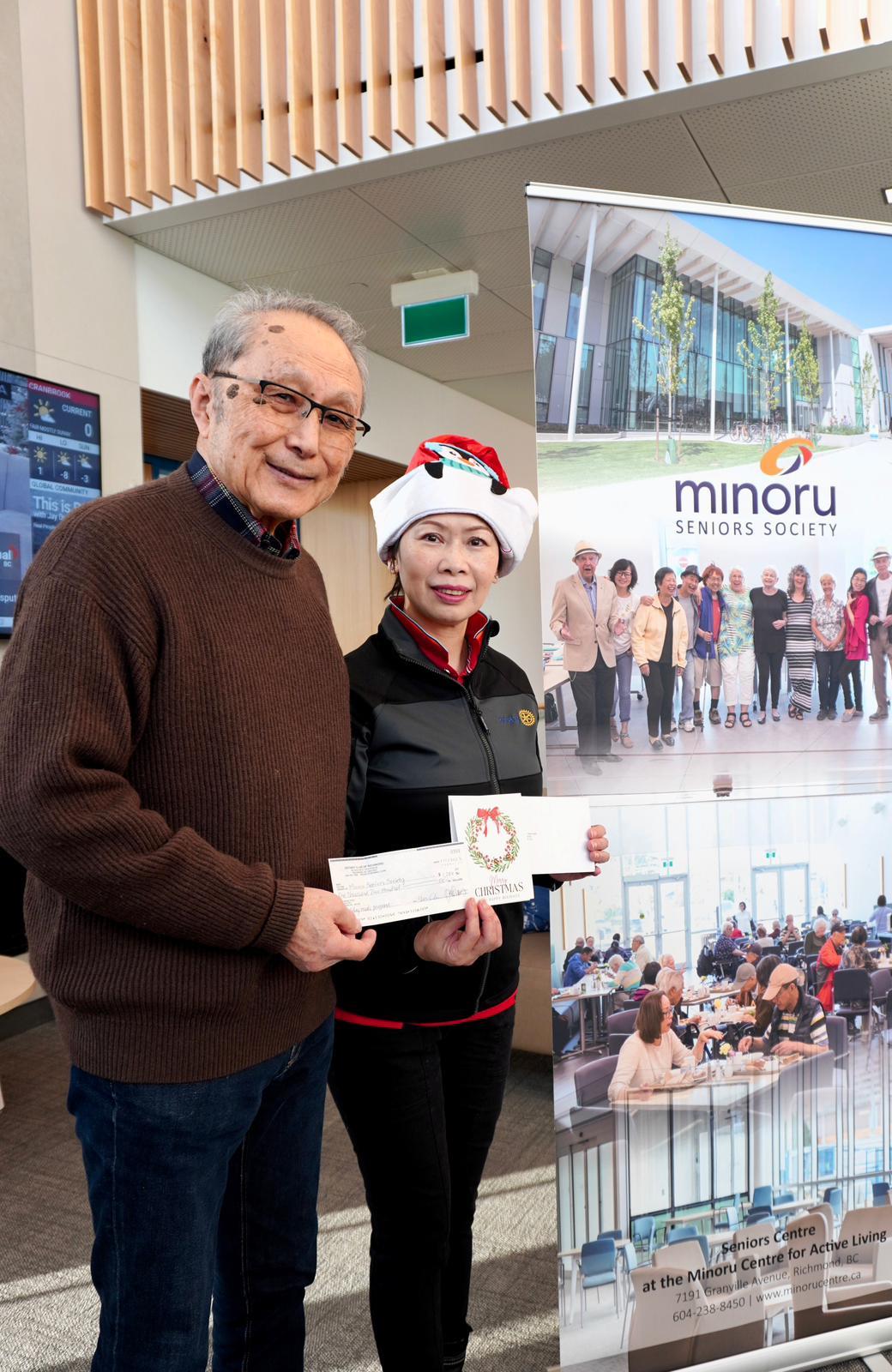 Every Christmas and holiday season, the Rotary Club of Richmond volunteers at the Minoru Seniors Society and provides a donation towards holiday meals for Richmond's seniors. Here are some photos of past Christmas visits to the Minoru Seniors Society in 2020, and 2021! (2020) This year, we donated $1200 to sponsor the Holiday meal program. As is tradition, Rotarians went door to door delivering the meals to Richmond seniors. The meal package includes a meal, a Christmas card, and gift cards! During the pandemic, the meal package included masks as well. Many of the seniors are vulnerable and low income, and a meal delivery is a necessity. Thanks to all Rotarians who participated in a great Richmond Rotary tradition. The Minoru Seniors Society is a critical pillar for Richmond seniors, improving quality of life and delivering innovative and exceptional programs and services.